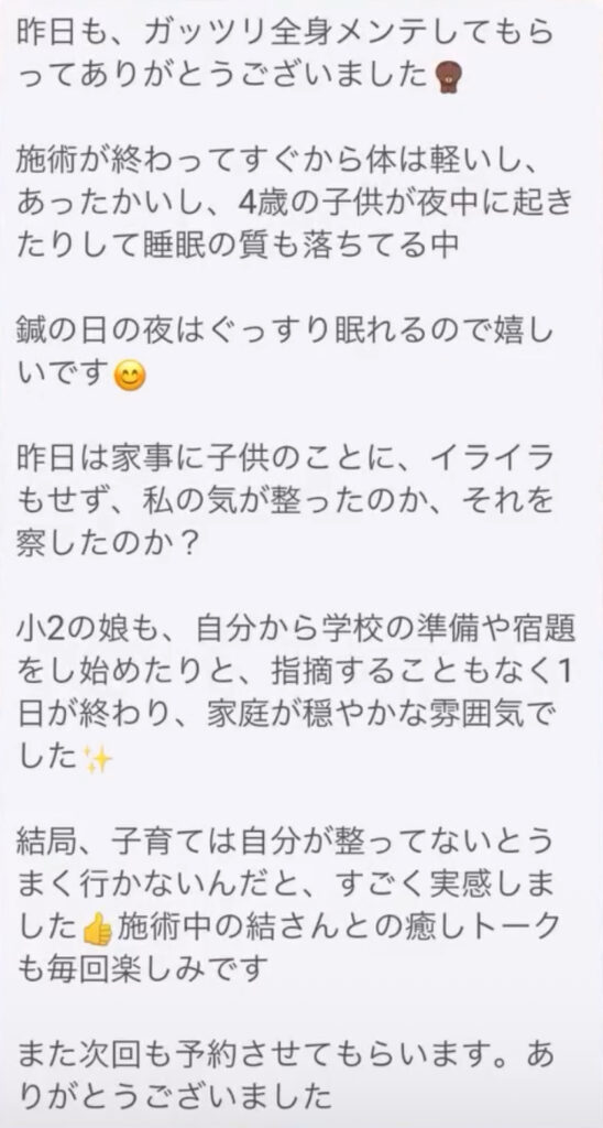 施術が終わってすぐから体は軽いし、あったかいし、4歳の子供が夜中に起きたりして睡眠の質も落ちてる中、鍼の日はぐっすり眠れるので嬉しいです。